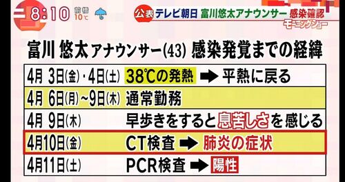 朝のニュースを見る限りでは、大きな違いがあるようには見えないけど、今後のワイドショーその他ではどうなっているか。 スタジオの消毒作業とかはもう終わっているかと思うんですが…そして富川キャスターのご回復と、周辺の濃厚接触者のご無事を祈ります 朝…