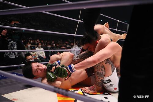 【RIZIN.34】弥益ドミネーター聡志、萩原京平に一本勝ち! 鮮やかな三角絞めで絞り上げる この一戦は1年以上に及ぶ萩原のアピールにより実現。試合決定会見では萩原は「今回地元・大阪の何万人というファンが見てる前で思いっきりぶっ飛ばして、サラリーマン…
