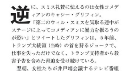 第二のウィル・スミスが出て来るのでは?という危惧(町山智浩コラム)…スミス礼賛におびえるのは女性コメディアンのキャシー・グリフィン。 「第二のウィル・スミスを気取る連中がステージに上がってコメディアンに暴力を振るうのが怖い」 週刊文春2022年4…