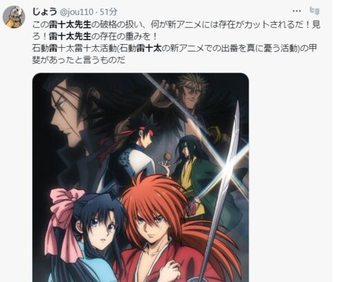 SNSでトレンドになっていた https://twitter.com/search?q=%E9%9B%B7%E5%8D%81%E5%A4%AA%E5%85%88%E7%94%9F&src=trend_click&vertical=trends実際に登場したわけじゃなく…9月末から「2クール目」になったけど、そこのOPかEDの画像に入った=登場することが…