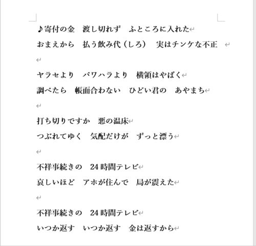 ♪寄付の金 渡し切れず ふところに入れた おまえから 払う飲み代(しろ) 実はチンケな不正 ヤラセより パワハラより 横領はやばく 調べたら 帳面合わない ひどい君の あやまち 打ち切りですか 悪の温床 つぶれてゆく 気配だけが ずっと漂う 不祥事続きの 24…