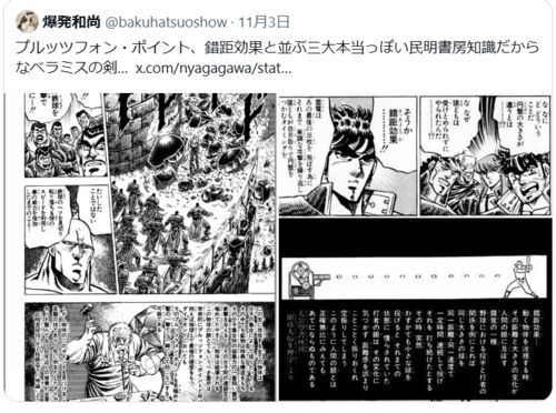 男塾と言えば民明書房のホラ話ですが、僕が一番信じたのはこの「ベラミスの剣」のエピソードだなぁ。これはほんとだと思った。 pic.twitter.com/JFct3Y1Esi— ニャガ山 (@nyagagawa) November 2, 2025 私は民明書房の『分子各構造その理論』ですね。『物体の…