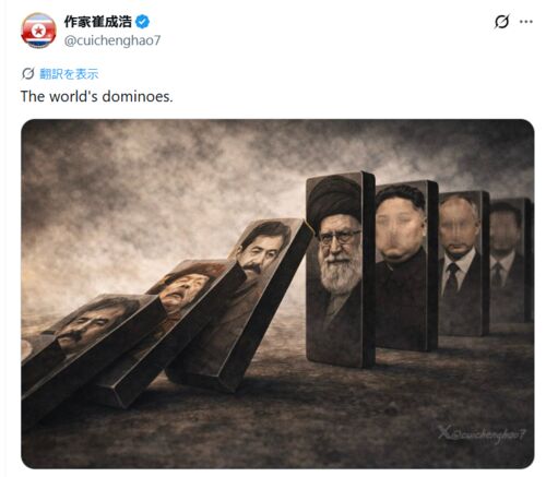 独裁者ドミノ倒しこれなThe world's dominoes. pic.twitter.com/WNHHb1SwyT— 作家崔成浩 (@cuichenghao7) 2026年1月10日 そもそもこうはいかないだろう、ということはあるし、トランプやネタニヤフは倒れないのか、とかいろいろあるが、今の状況がどこかで連…