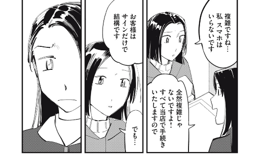 店頭では「このサービスがお得ですって!」「いらないです!」とギスギスしたやり取りに終始した女性2人が、書店の「BLコーナー」の棚でばったり。実は同じ趣味の似た者同士と解り、急速に親しく…