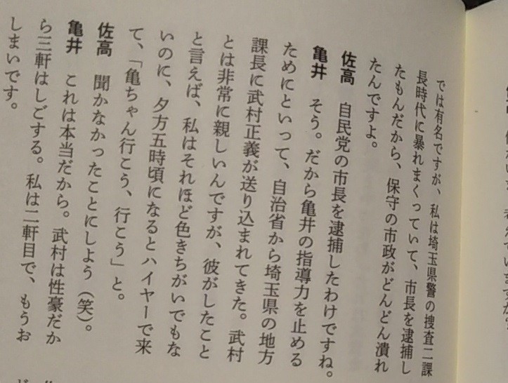 亀井 (略)…私は埼玉県警の捜査二課長時代に暴れまくっていて、市長を逮捕したもんだから、保守の市政がどんどん潰れ たんですよ。