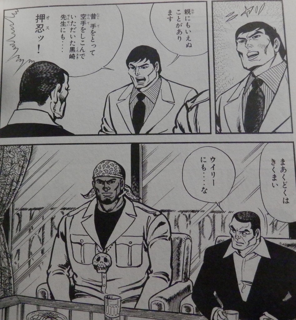 ただ自分は、ただ自分は……そこで投げ出さずに「あのミスター X は替え玉。本物は極真空手を散々挑発したXに激怒した、あの男が…これ以上は言えない、ウフフッ」みたいな形でとりあえず辻褄合わせをした、梶原一騎の手腕を高く評価するものである。親にも言えぬことがあります、押忍ッ(梶原一騎「四角いジャングル」より)
