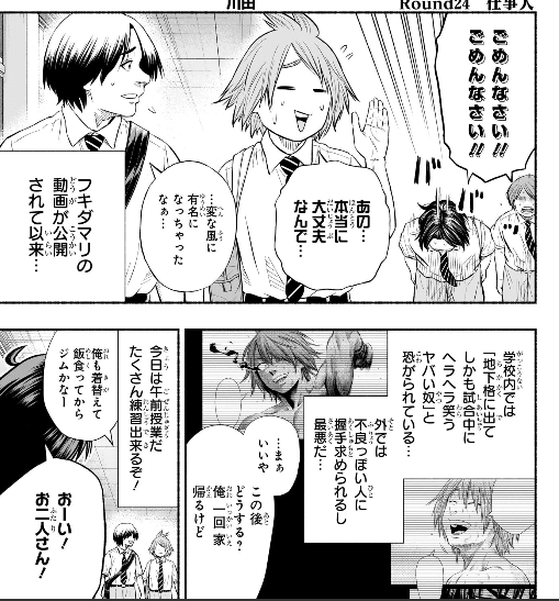 んで、22話までで地下格闘技大会「FUKIDAMARI」で優勝し、そのエピソードに一区切りがついたのだけれども、同団体で優勝した結果、主人公の明日見二兎は、なんか佐野哲也みたいになっちゃった。