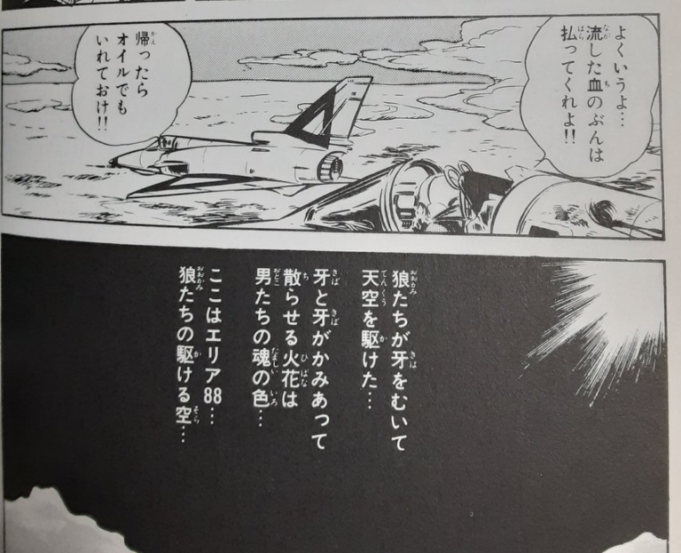 「狼たちが牙をむいて天空を駆けた… 牙と牙がかみあって散らせる火花は男たちの魂の色 ここは少年ジャンプ… 狼たちの駆ける空…」(エリア88ポエムが良く似合う雑誌だ)