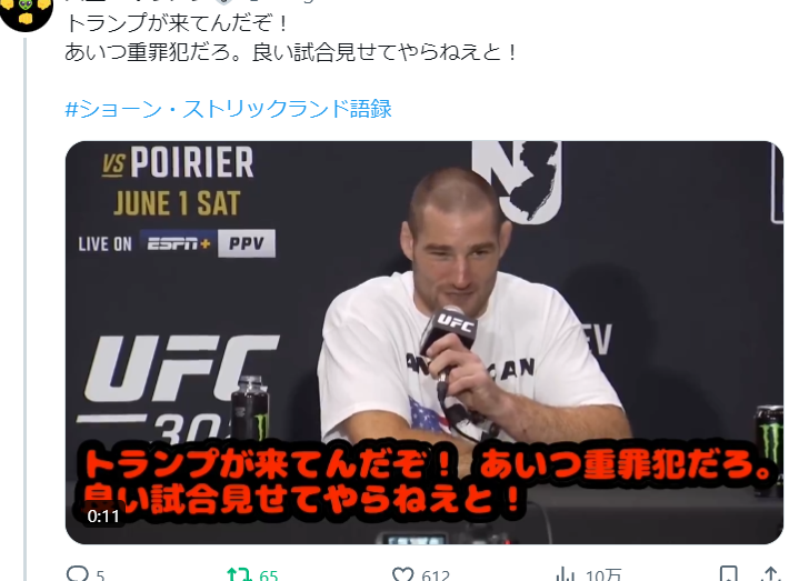 トランプは現職時代にもUFCに来て「天覧試合」をしているぐらいで、来てもおどろないし、ストリックランドが支持してるのかしてないのかわからんぐらい危ないジョークをいいつつ、最後は好意的?なのもさもありなん、だが…