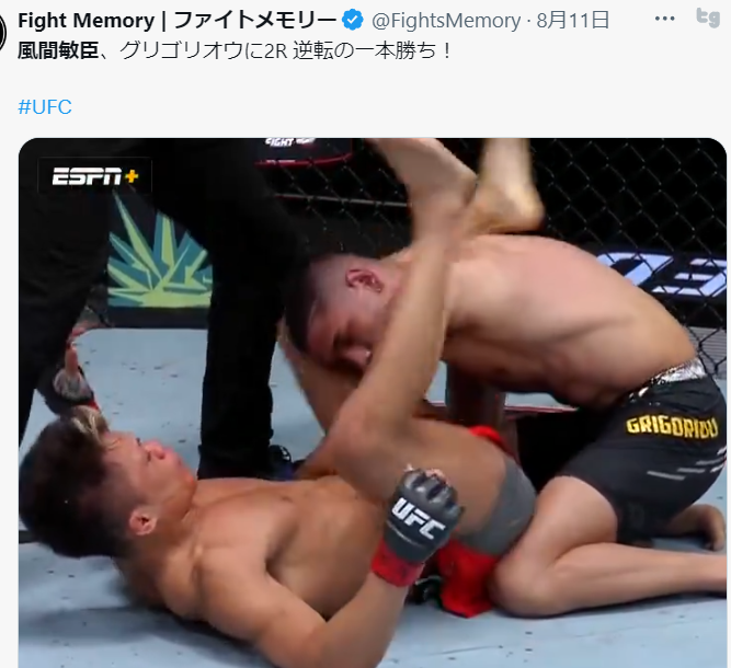 風間敏臣、開始序盤から成長も気持ちも見えて、最後まで諦めず得意の形で極めたこの白星は大きすぎる #UFCVegas95pic.twitter.com/iwfTHKuobK