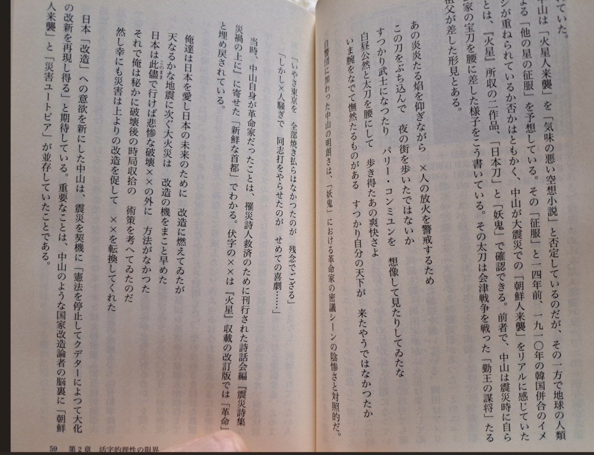 それで俺は秘かに破壊後の時局収拾の術策を考へてゐたのだ 然し幸にも災害は上よりの改造を促して××を転換してくれた日本「改造」への意欲を新にした中山は、震災を契機に「憲法を停止してクデターによつて大化の改新を再現し得る」と期待している。重要なことは、中山のような国家改造論者の脳裏に「朝鮮人来襲」と「災害ユートピア」が並存していたことである。