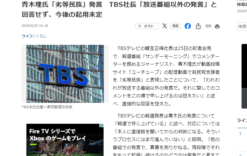 TBSテレビの龍宝正峰社長は25日の記者会見で、報道番組「サンデーモーニング」でコメンテーターを務めるジャーナリスト、青木理氏が動画投稿サイト「ユーチューブ」の配信動画で自民党支援者を「劣等民族」と表現したことについて、「われわれが放送する番組以外の発言だ。それに関してのコメントをこの場で申し上げるのは控えたい」と述べ、直接的な回答を控えた。