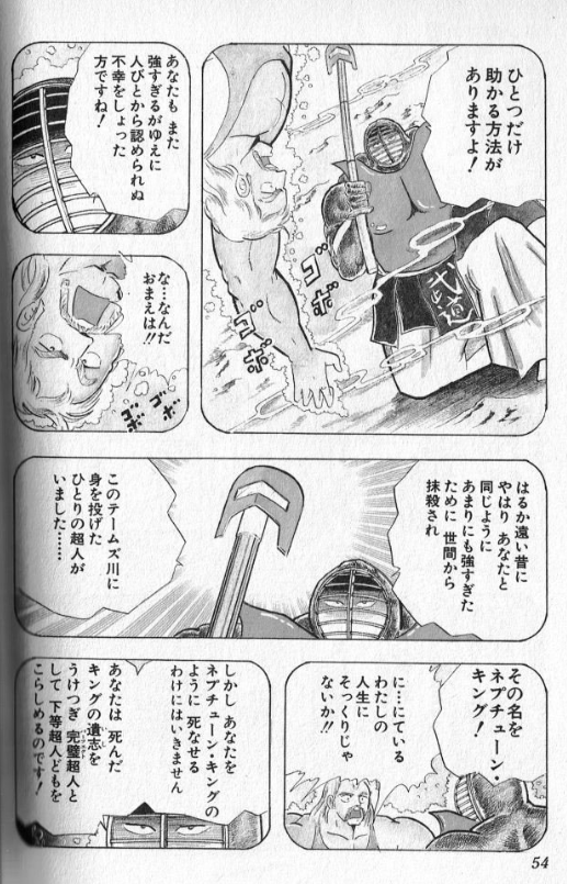 …その正体が“完璧超人の真の首領”・ネプチューンキングであることが後に明らかになり、ネプチューンマンとの主従関係も実際は真逆の立場にあることが判明する。ちなみに服装は武道のままであり、前垂部分も「武道」のままとなっている。