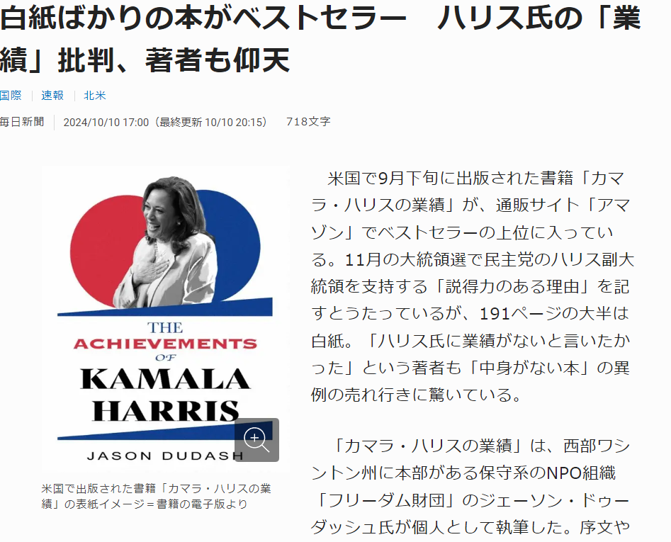 ページをめくると白紙ばかりだと示す動画が話題になり、アマゾンでの売り上げも増加。9日時点でベストセラーのランキングでトップ20に入っており、「政治的ユーモア」部門ではトップだ。ドゥーダッシュ氏は毎日新聞の書面での取材に「ハリス氏が20年以上公職にありながら、文字通り何も国民にもたらしていないことを示したかった。彼女は出世よりも、笑いの種にされる方がふさわしい」と“執筆”の理由を・・(後略)