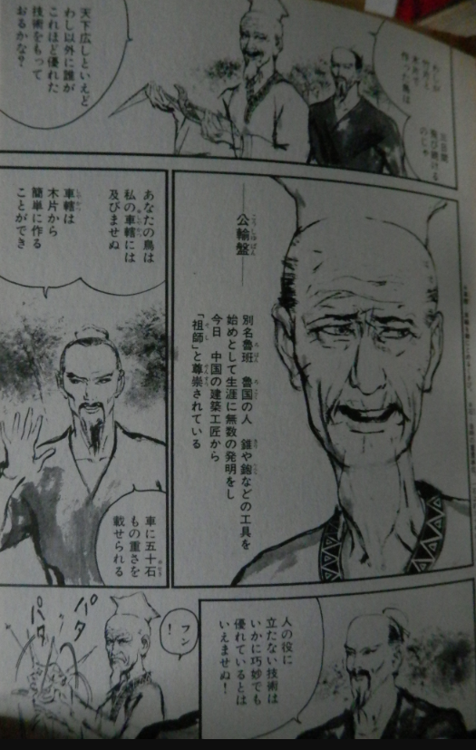 彼が竹・木で作った「鳶」は3日間翔び続けたという伝説が『酉陽雑俎』・『論衡』に記載されているほか、巧緻な器具を数多く製作し、鉋・錐などを発明したともいう。