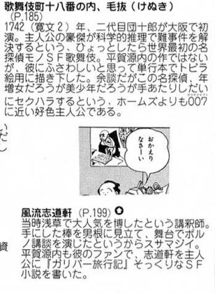 歌舞伎の演目のなかに「推理小説風」、の作品、平賀源内の作品の中に「ガリバー旅行記」張りの作品(異世界旅行ね)があるという。