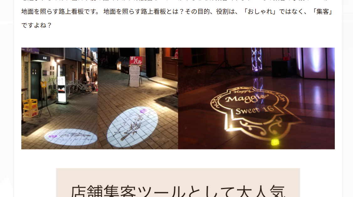 店舗の前を歩く人々の路上に照らす看板のことです。 飲食店舗は、廃業率が非常に高く、10年以上の生存率は数%と言われています。 このように多くの飲食店が廃業に追いやられる最大の原因が集客と言われています。 味を追求するのは、当たり前の話ですが、飲食店オーナーがやることは集客ですよね? その集客の手段の一つが地面を照らす路上看板です。 地面を照らす路上看板とは?その目的、役割は、「おしゃれ」ではなく、「集客」ですよね?