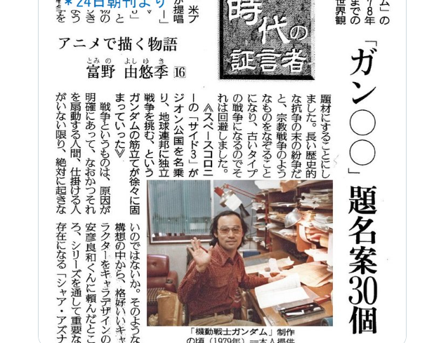 朝刊連載「時代の証言者 アニメで描く物語~富野由悠季さん」が始まりました。「機動戦士ガンダム」を生んだアニメーション映画監督の富野さんは「鉄腕アトム」で演出家デビュー。軍需工場に勤めた化学者の父、影響を受けた漫画など、ガンダムの背景となりうるエピソードが続々登場します。(創) pic.twitter.com/QExZGUGvsD
