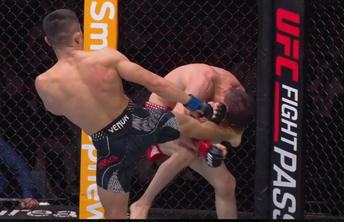 最初はカーフキックを当てたとき、よしよし、これで少しでも出足が鈍って、判定に有利になれば、それで御の字よ、となめたことを思ってしまったのさ。しかし、何度か…あれ?と思う場面があった、と思ったら、相手がよたよたとバランスを崩す!あのタフなMMAファイター、それもUFCランカーが、はっきり足にダメージを負ったと、相手とジャッジと観客にさらけ出してしまったのだ。