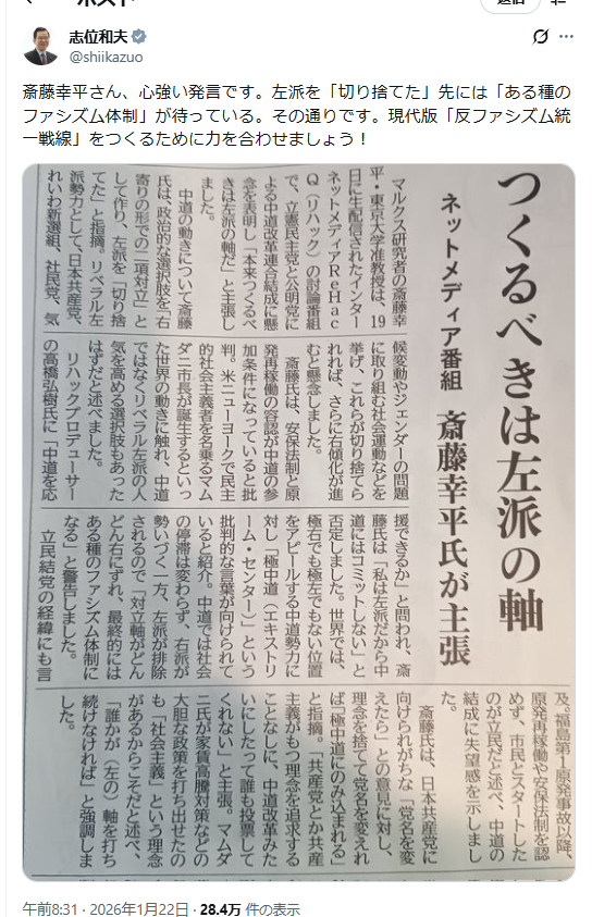 — 志位和夫 (@shiikazuo) January 21, 2026