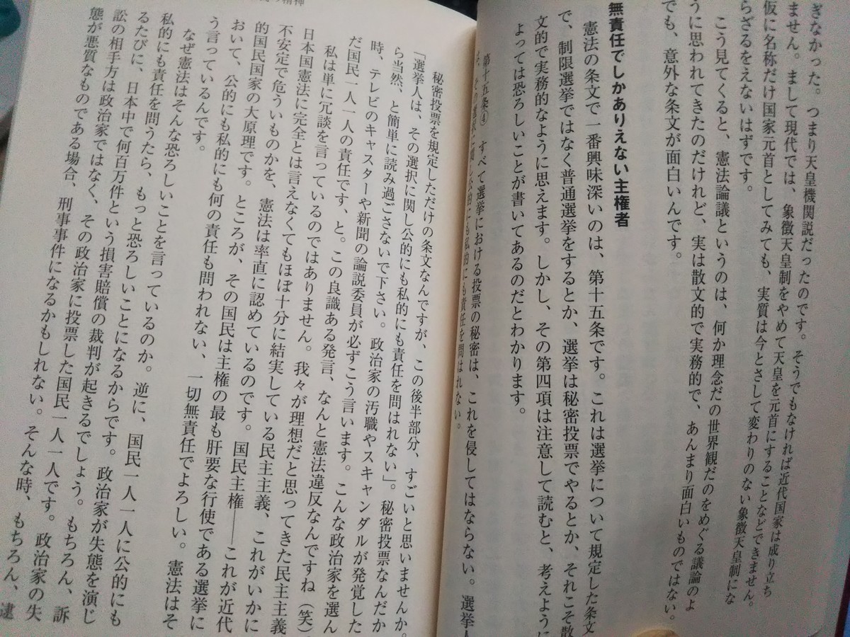 憲法第15条と有権者の「無責任」~呉智英「ホントの話」 なぜ憲法はそんな恐ろしいことを言っているのか。逆に、国民一人一人に公的にも私的にも責任を問うたら、もっと恐ろしいことになるからです。政治家が失態を演じるたびに、日本中で何百万件という損害賠償の裁判が起きるでしょう。もちろん、訴訟の相手方は政治家ではなく、その政治家に投票した国民一人一人……刑事事件になるかもしれない。そんな時、もちろん逮捕されるのはその政治家だけでなく、その政治家に投票した何百万人という国民全員…(略)そんな事態になったら、国民的統合が崩れるどころではない。社会そのものが成立しくなる。だから、国民は国家の主権者でありながら主権の行使に責任を負わせるわけにはいかないのです。